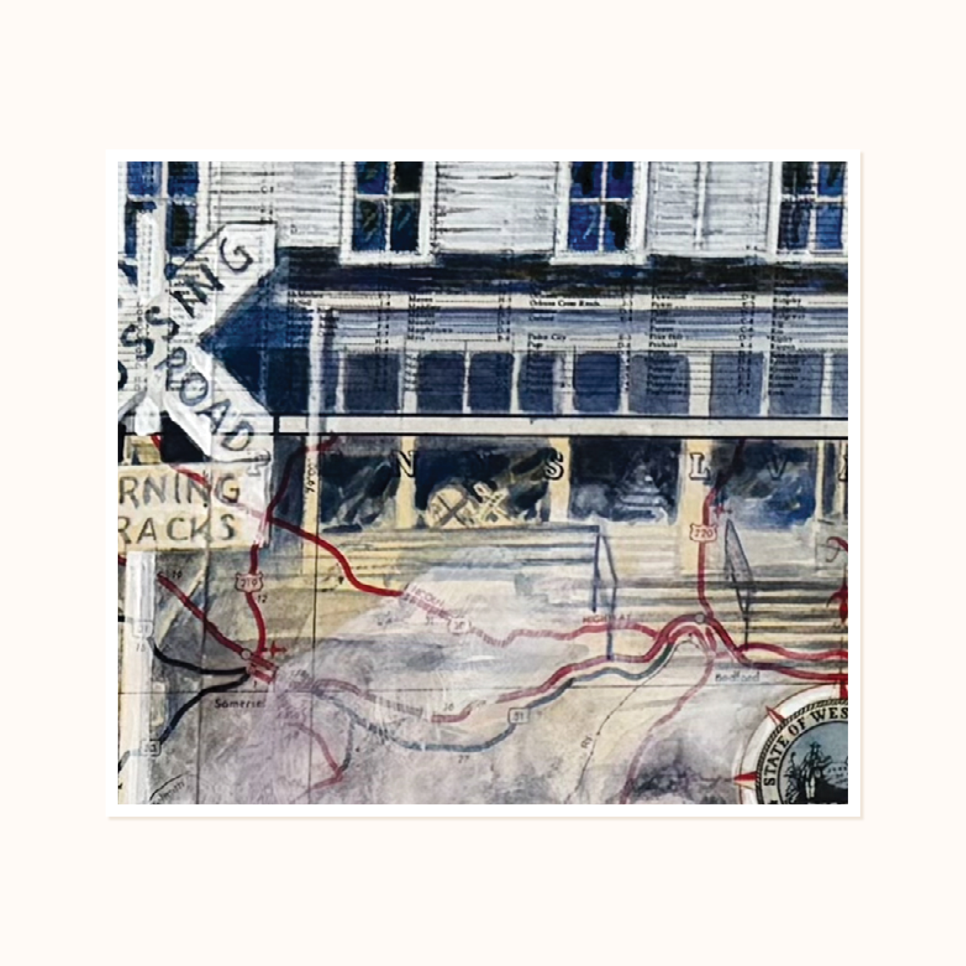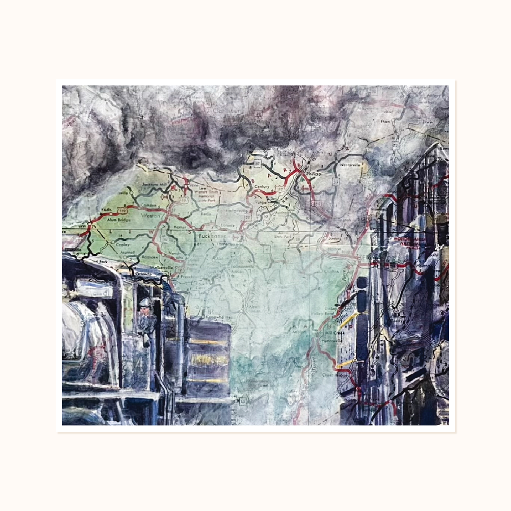 This piece brings the magic of Cass to life in a way only Katy Crim can. Painted over a vintage West Virginia highway map, the artwork shows the Cass Scenic Railroad locomotive pushing through a cloud of steam, surrounded by soft details from the town and the landscape. The old company store, the river, the rails, and the fall colors all come together like memories layered on a map.